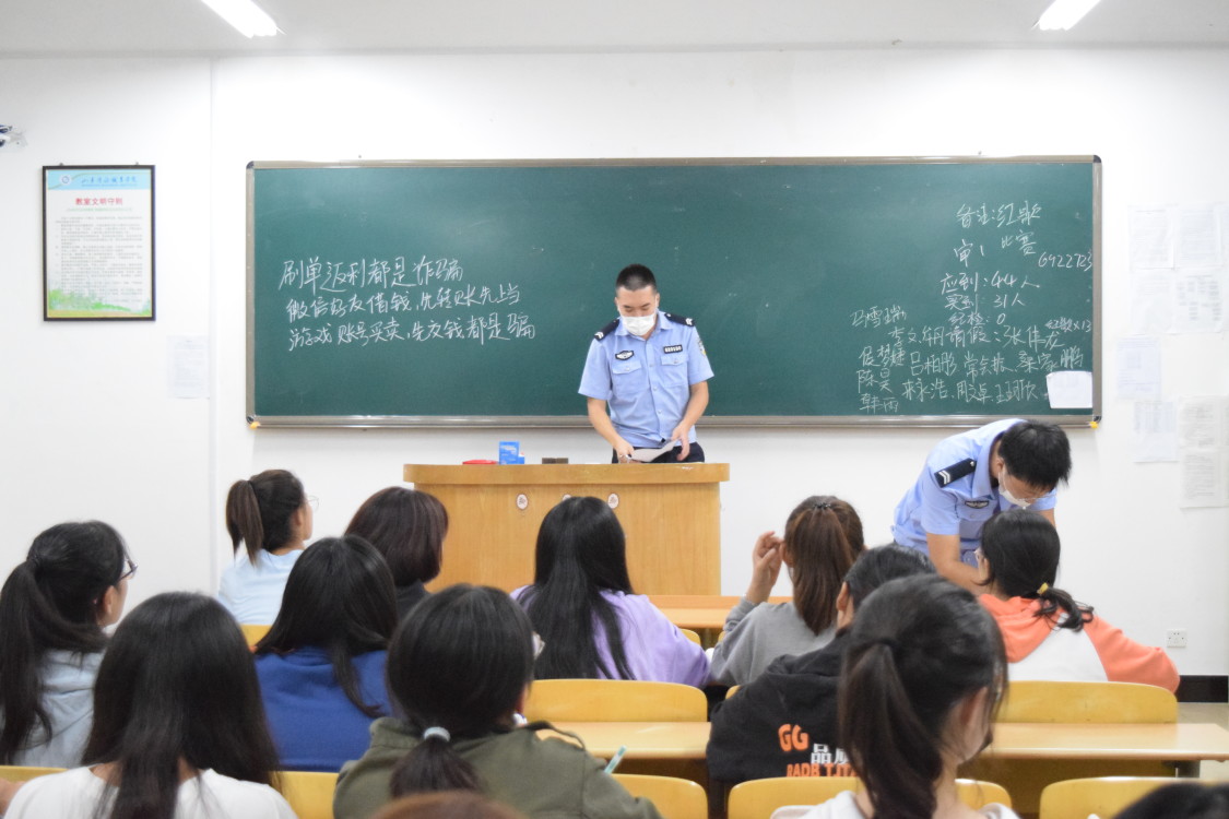 民警针对新生容易遭受冒充熟人、冒充客服、网络刷单等类型的电信网络诈骗,结合多年的办案经验,通过生动的语言、典型的案例,形象地为同学们分析了犯罪分子在诈骗过程中的一些惯用伎俩,引导同学们思考和学习防骗技巧,通过交流互动,切实提升了新生的安全意识和防范水平。