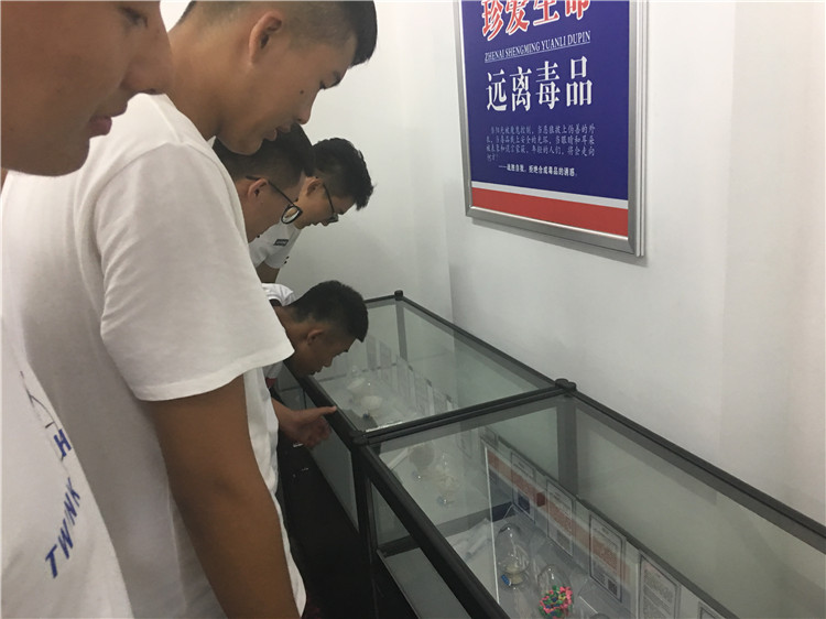 学生干部们通过观看毒品模型展示柜,了解了毒品对人体的危害非常大,大量或者长期使用毒品,会对人的身体产生严重的损害,如神经障碍,意识不清,染上毒品之后会产生依赖性,使人走上犯罪道路。