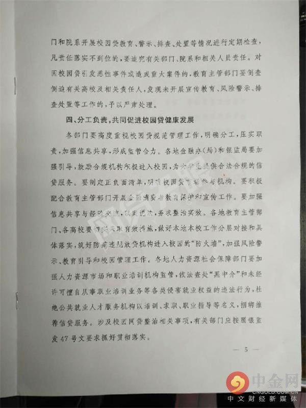 4.分工负责,共同促进校园贷健康发展。各地金融办(局)和银监局要加强引导,鼓励合规机构积极进入校园,为大学生提供合法合规的信贷服务。要制定正负面清单,明确校园贷市场参与机构。各地教育主管部门、各高校要切实采取有效措施,做好本地本校工作分层对接和具体落实,筑好防范违规放贷机构进入校园的“防火墙”。各地人力资源部门要加强人力资源市场和职业培训机构监管,依法查处“黑中介”和未经许可擅自从事职业培训业务等各类侵害就业权益的违法行为,杜绝公共就业人才服务机构以培训、求职、职业指导等名义,捆绑推荐信贷服务。