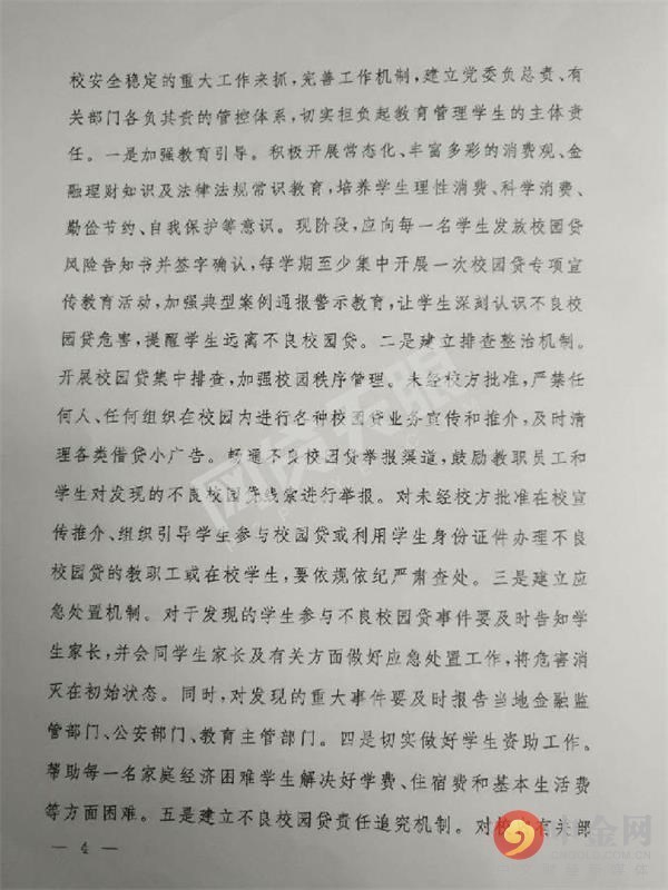 3.综合施策,切实加强大学生教育管理。一是加强引导,现阶段,学校应向每一名学生发放校园贷风险告知书并签字确认,每学期至少集中开展一次校园贷专项宣传教育活动,加强典型案例通报警示教育。二是建立排查整治机制。未经校方批准,严禁任何人、任何组织在校园内进行各种校园贷业务宣传和推介,及时清除各类借贷小广告。畅通不良校园贷举报渠道。三是建立应急处置机制。对于发现学生参与不良校园贷事件要及时告知学生家长,会同学生家长及有关方面做好应急工作,将危害消灭在初始状态。四是切实做好学生资助工作。五是建立不良校园贷责任追究机制。
