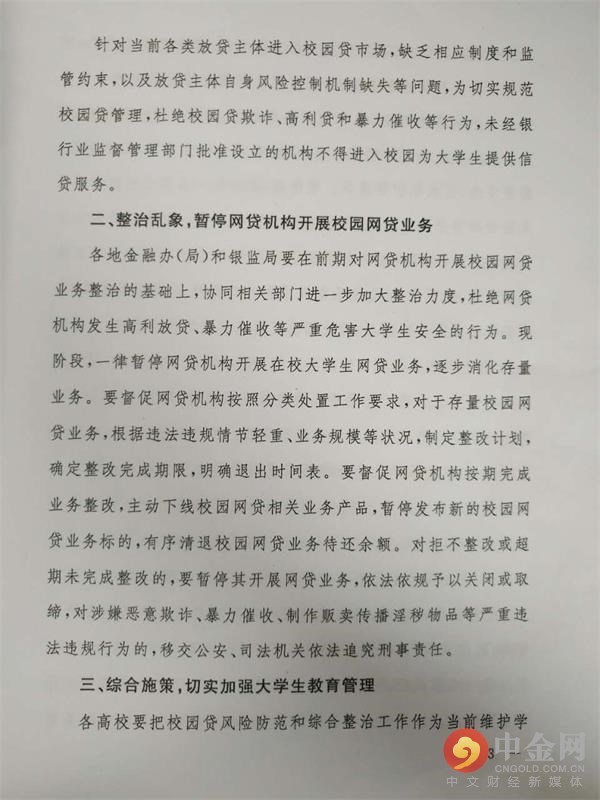 2.整治乱象,暂停网贷机构开展校园贷业务。现阶段,一律暂停网贷机构开展在校大学生网贷业务,逐步消化存量业务。要督促网贷机构按照分类处置要求,对于存量校园贷业务,根据违法违规情节轻重、业务规模等情况,制定整改计划,确定整改完成期限,明确退出时间表。对拒不整改或超期未完成整改的,要暂停其开展网贷业务,依法依规予以关闭或取缔,对涉嫌恶意欺诈、暴力催收、制作贩卖传播淫秽物品等严重违法违规行为的,移交公安、司法机关依法追究刑事责任。